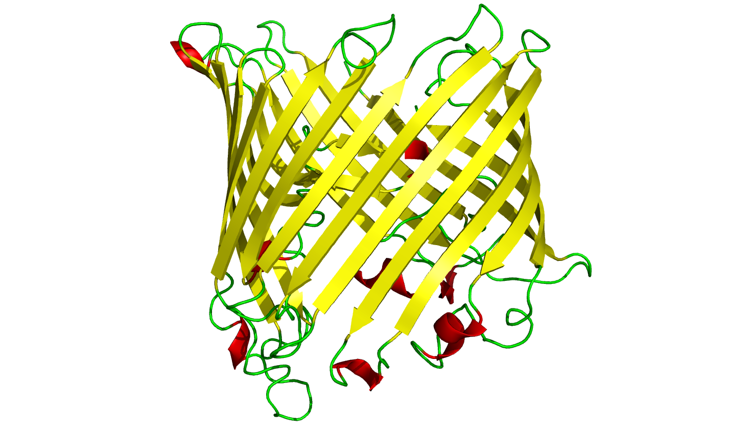 Hier sieht man ein Porin aus der Zellmembran von Salmonellen. Salmonellen sind Bakterien (Prokaryoten), und Porine sind Proteine, die eine Pore in der Zellmembran bilden, durch die hydrophile polare Stoffe wie zum Beispiel Saccharose die Membran passieren können. Porine kommen bei Prokaryoten und den von Prokaryoten abstammenden Mitochondrien und Chloroplasten vor (in der inneren Membran).