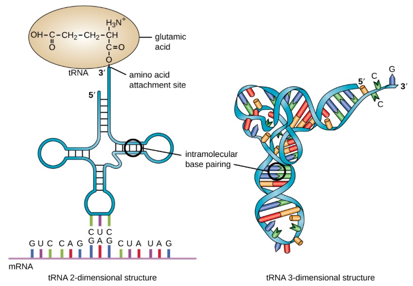 Hier sehen wir ein Wikicommons-Bild, das sowohl die zwei- wie auch die dreidimensionale Struktur der tRNA zeigt. Außerdem kann man sehr schön erkennen, wie die Aminosäure (hier Glutaminsäure) über die COOH-Gruppe ihres Grundgerüste mit dem 3'-Ende der tRNA verbunden ist. Und schließlich ist auch die Paarung des Anticodons CUC mit dem Codon GAG auf der mRNA zu sehen.