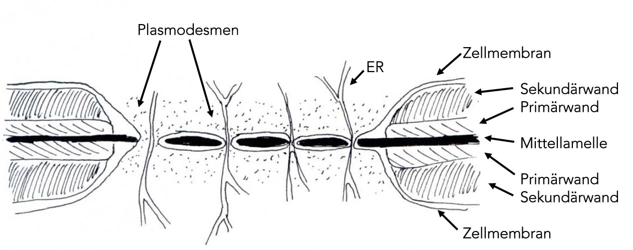 Die Plasmodesmen durchziehen die Zellwand an bestimmten Stellen, den sogenannten Tüpfeln. Hier ist nur die Primordialwand oder Mittellamelle ausgebildet, Primärwand und Sekundärwand fehlen: