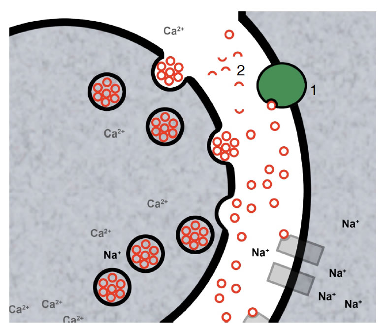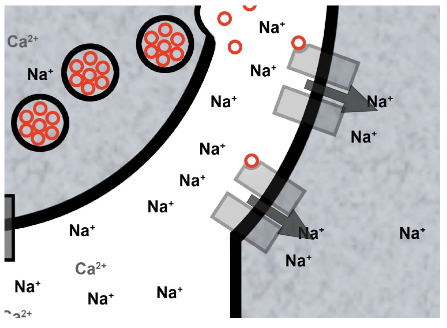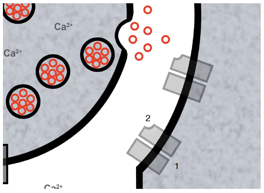 Nach neueren Vorstellungen wirken die Calcium-Ionen aber hauptsächlich auf die Fusion (Verschmelzung) der synaptischen Vesikel mit der präsynaptischen Membran.