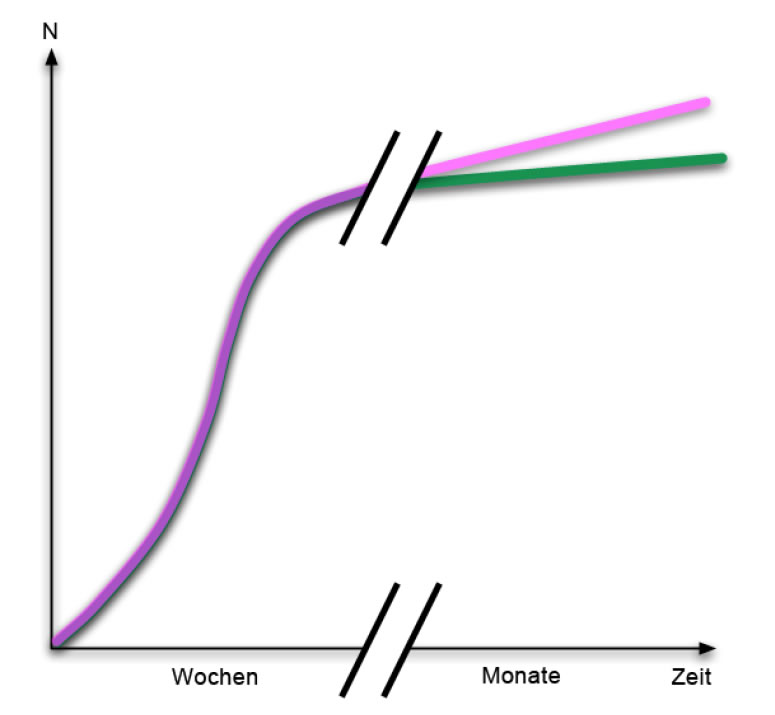 Bereits DARWIN hatte erkannt, dass Tiere und Pflanzen stets mehr Nachkommen hervorbringen, als eigentlich zur Erhaltung der Art notwendig wären (siehe dazu auch: Selektion und Anpassung). Schauen wir uns dazu noch einmal das Bild zum logistischen Wachstum an, das wir auf der letzten Seite besprochen hatten: