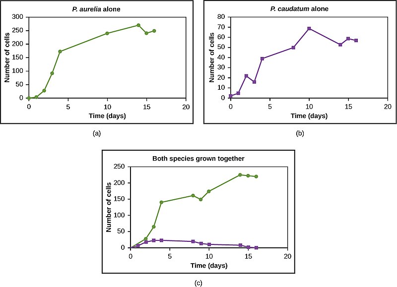 Graphs demonstrating the competitive exclusion principle. Paramecium aurelia and Paramecium caudatum grow well individually, but when they compete for the same resources, the P. aurelia outcompetes the P. caudatum. Quelle: Wikipedia.