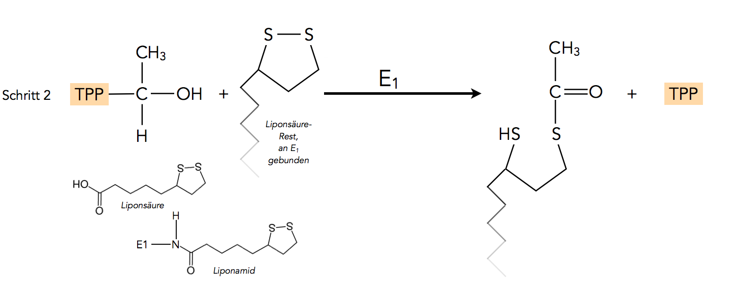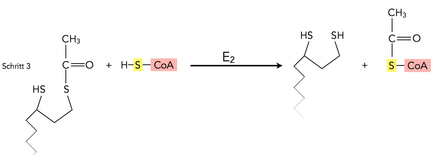 Im dritten Schritt dieser komplexen Reaktion wird der Acetyl-Rest von der Liponsäure-Einheit der Pyruvatdehydrognase (E1) von dem nächsten Enzym (E2) des Multienzymkomplexes auf ein Coenzym-A-Molekül übertragen. Es entsteht Acetyl-Coenzym A, und die Liponsäure-Einheit bleibt zurück, allerdings noch offenkettig, die beiden Schwefel-Atome liegen in reduzierter Form als SH-Gruppen vor.