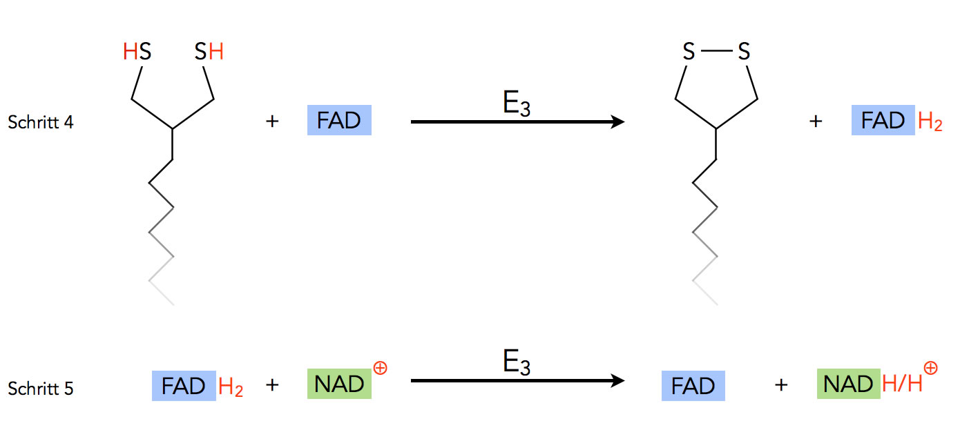 Die Liponsäure-Regeneration und die NADH/H+-Bildung wird durch das dritte Enzym (E3) durchgeführt: