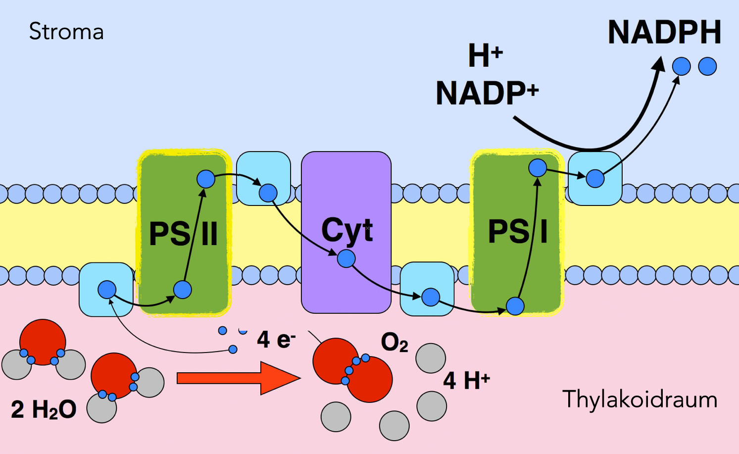 Allerdings ist es so, dass die Absorption eines Photons immer nur ein Elektron aktiviert und zum Cytochrom befördert. Um die zwei Wasser-Moleküle zu spalten, bedarf es also vier solcher Photonen!