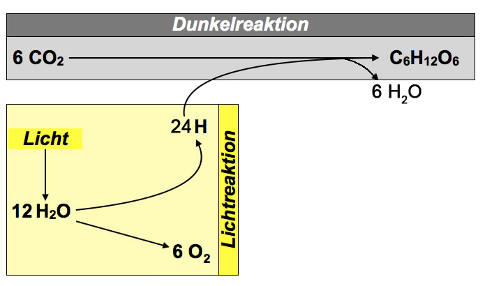 Bei der Dunkelreaktion werden diese NADPH/H+-Einheiten dann benötigt, um Kohlendioxid zu Glucose zu reduzieren: