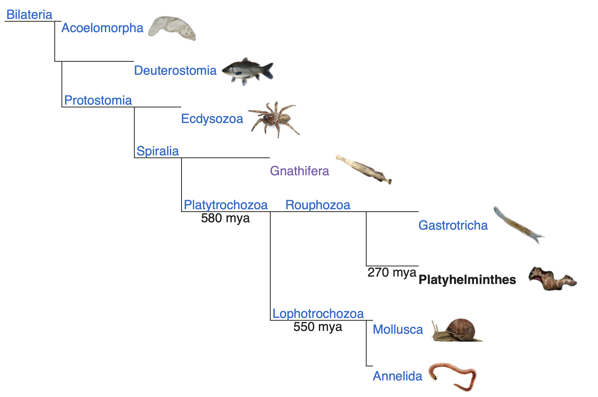 Vor ca. 580 Millionen Jahren haben sich die Platytrochozoa, zu denen auch die Plathelminthes gehören, von den Gnathifera getrennt.