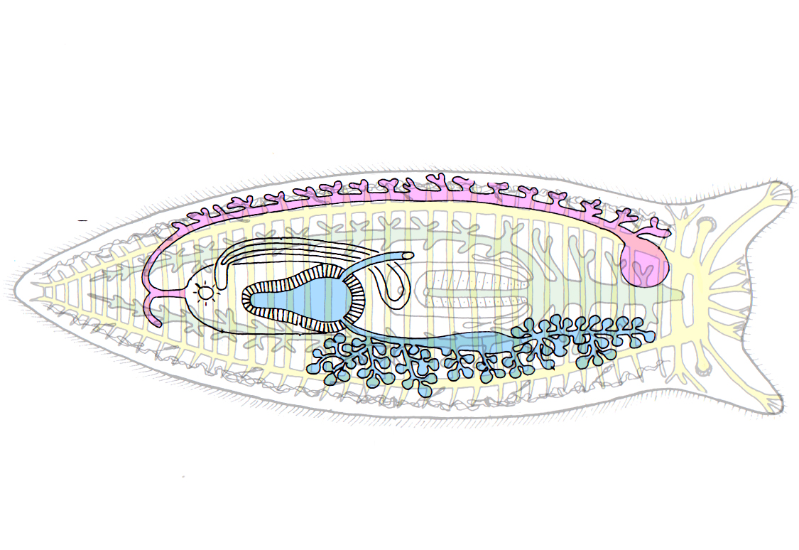 Geschlechtsorgane eines Strudelwurms (rot = weiblich, blau = männlich)