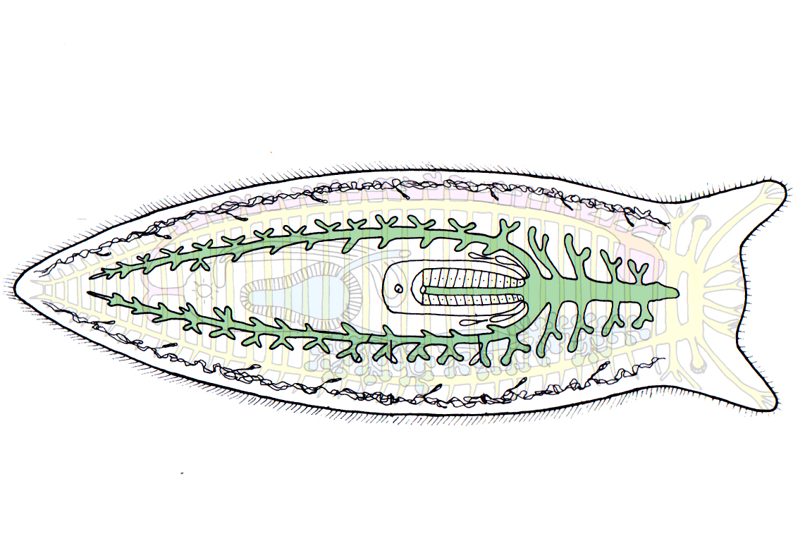 In der Abbildung 2 ist das Protonephridien-Netzwerk gut zu erkennen, in der Peripherie des Tieres.