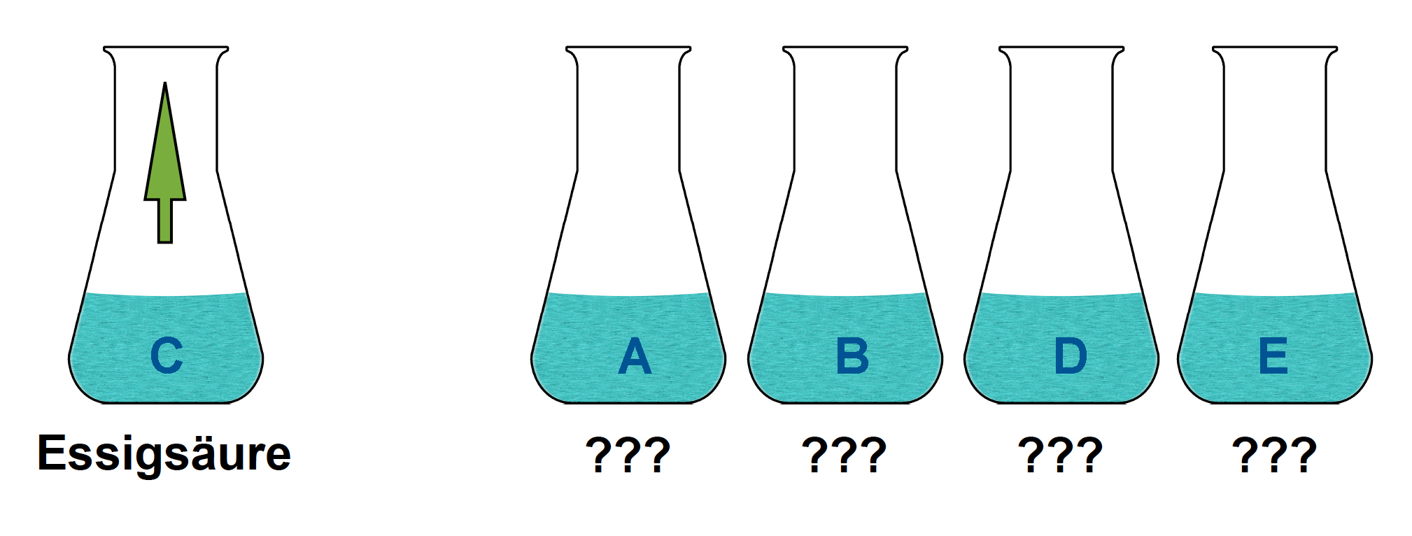 Vorsichtige Geruchsprobe von jeder Flüssigkeit. Der Stoff in Kolben C riecht sehr stark nach Essig, damit steht schon einmal fest, dass sich im Kolben C die verdünnte Essigsäure befindet.