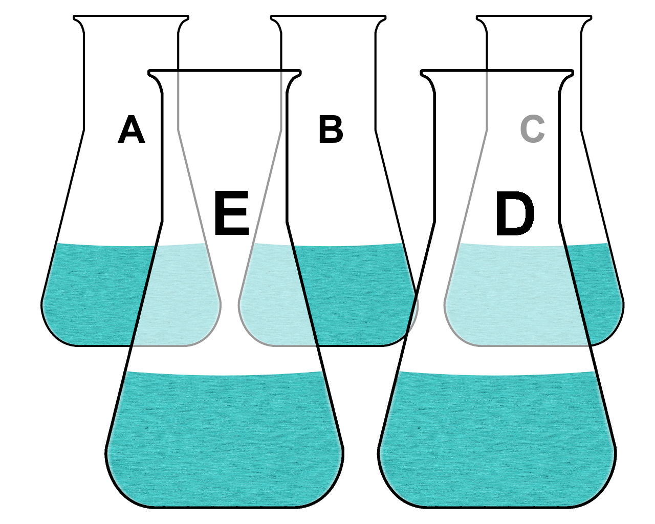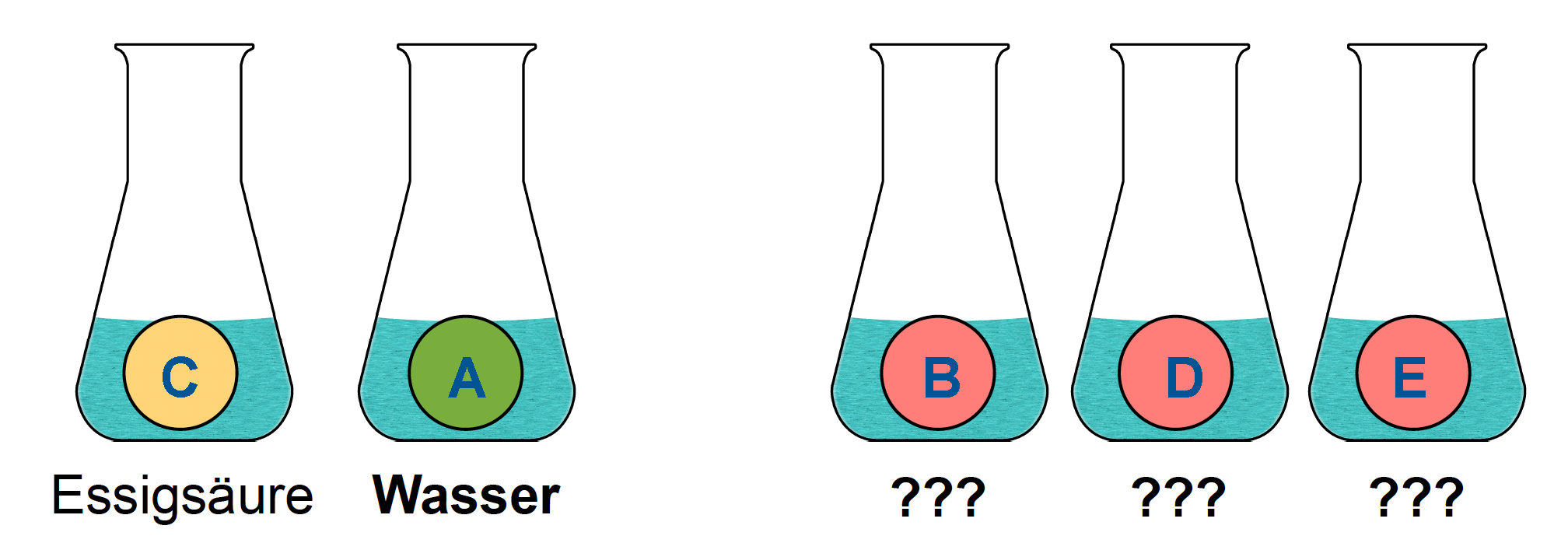 In fünf Erlenmeyerkolben A bis E befinden sich folgende Flüssigkeiten: