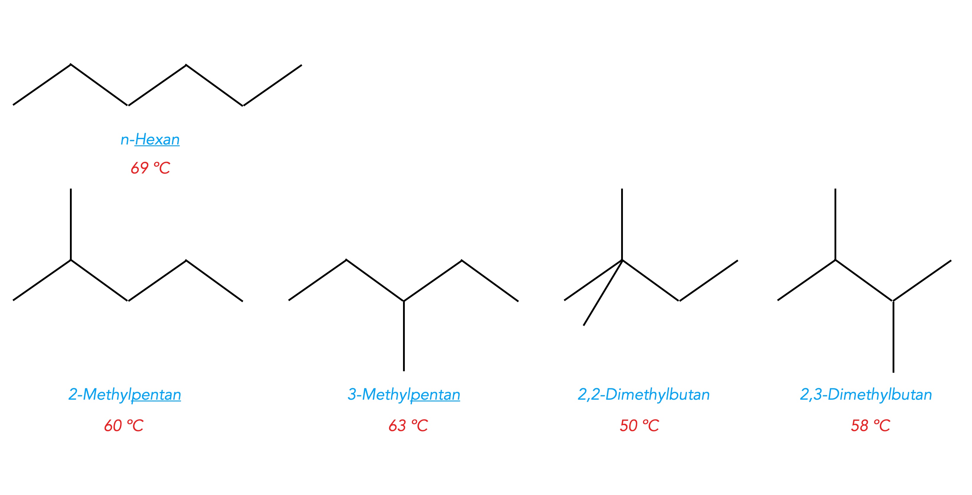 Die fünf Hexan-Isomere und ihre Siedetemperaturen