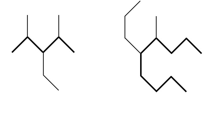 Die Hauptketten bzw. Grundgerüste sind schon durch Fettdruck hervorgehoben. Links sehen wir ein Alkan mit einem Pentan-Grundgerüst, rechts ein Alkan mit einem Nonan-Grundgerüst. Das links Alkan besitzt zwei Methyl- und eine Ethyl-Seitenkette, das rechte Alkan eine Methyl und eine Propyl-Seitenkette.