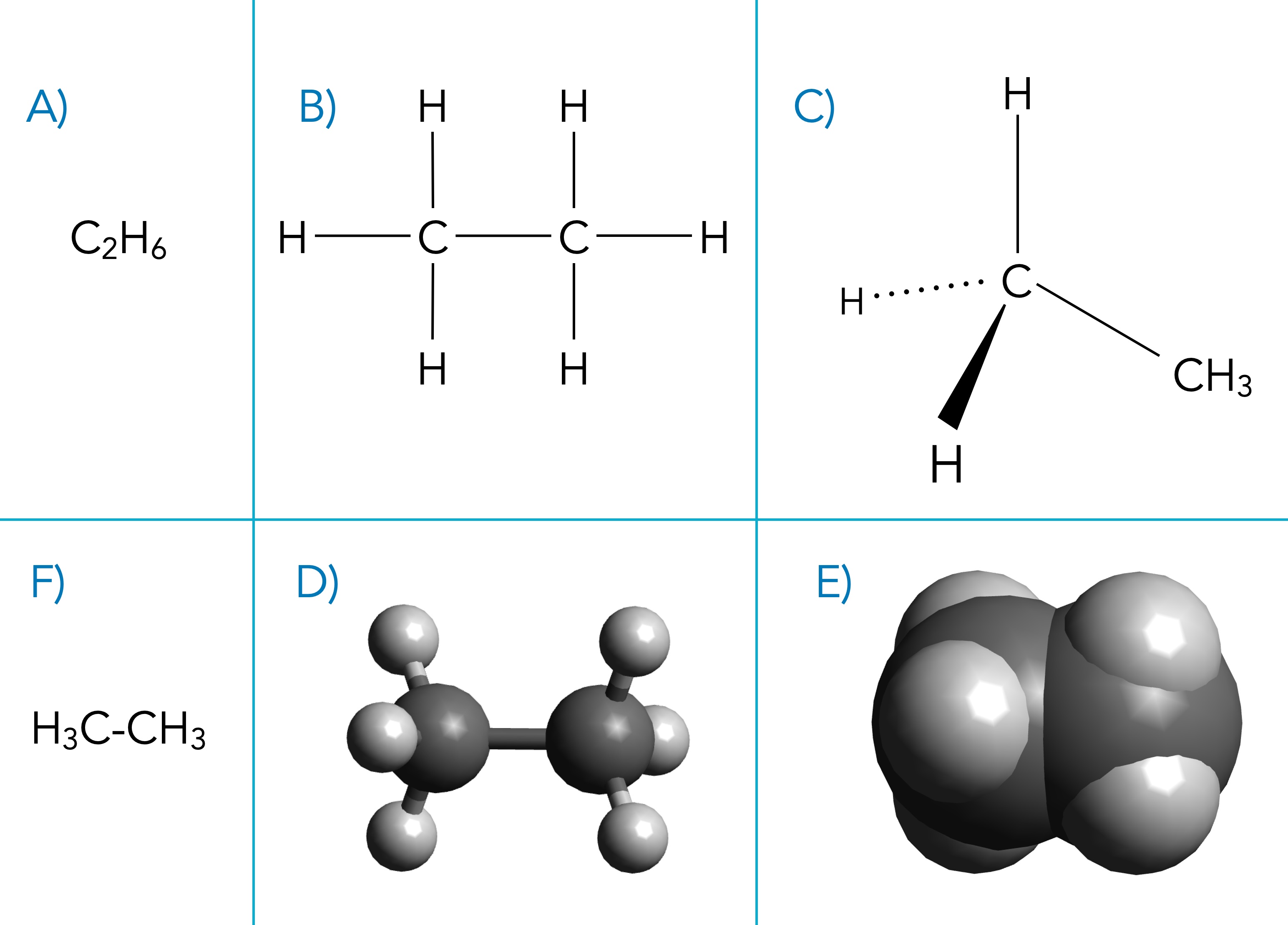 In dem Bild sehen Sie verschiedene Darstellungen des Ethan-Moleküls. Erläutern Sie den Vorteil der Darstellungsweise F), die oft als "abgekürzte Strukturformel" bezeichnet wird.