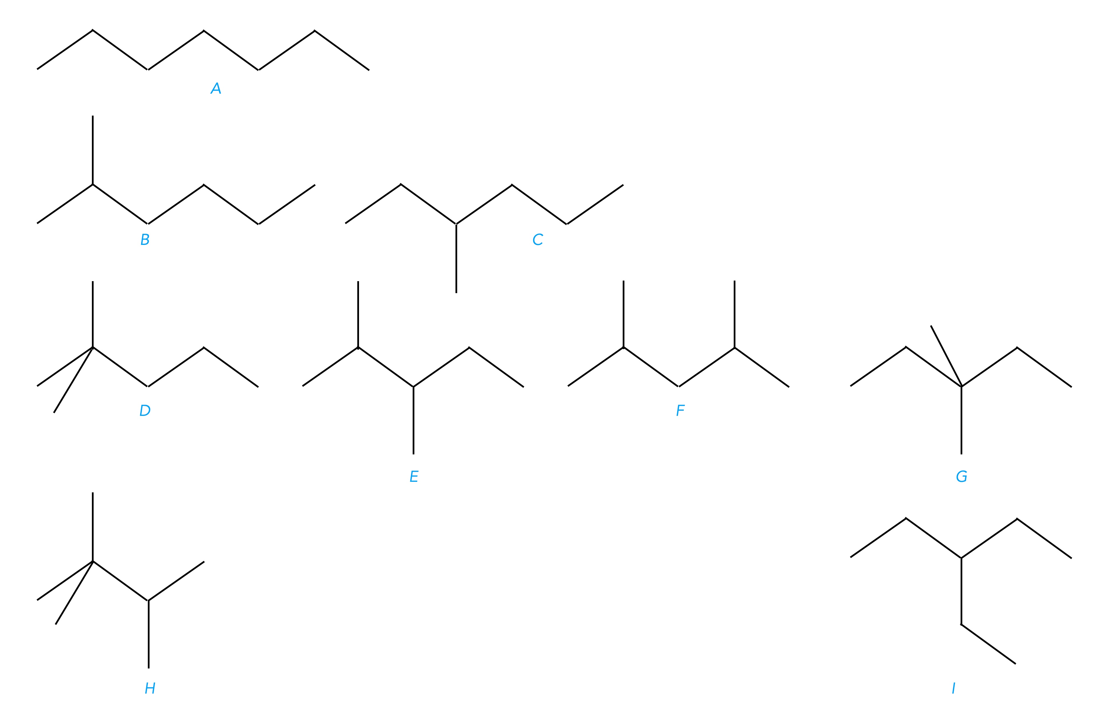 Entsprechend bezeichnen wir E) und F) als 2,3-Dimethylpentan und 2,4-Dimethylpentan sowie G) als 3,3-Dimethylpentan.