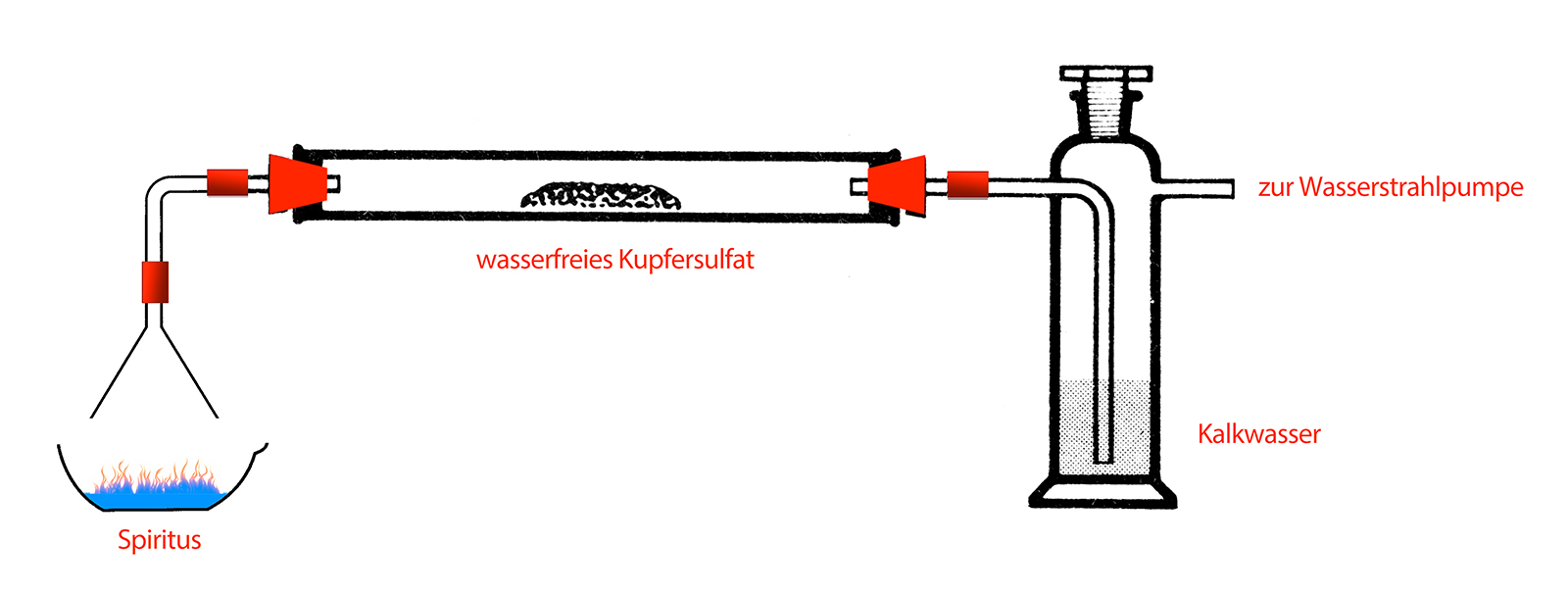 Die Verbrennungsprodukte werden zunächst über den Trichter (links) aufgefangen und in ein Verbrennungsrohr geleitet, in dem sich etwas wasserfreies Kupfersulfat befindet. An das Verbrennungsrohr ist eine Gaswaschflasche angeschlossen, in der sich Kalkwasser Ca(OH)2 befindet.