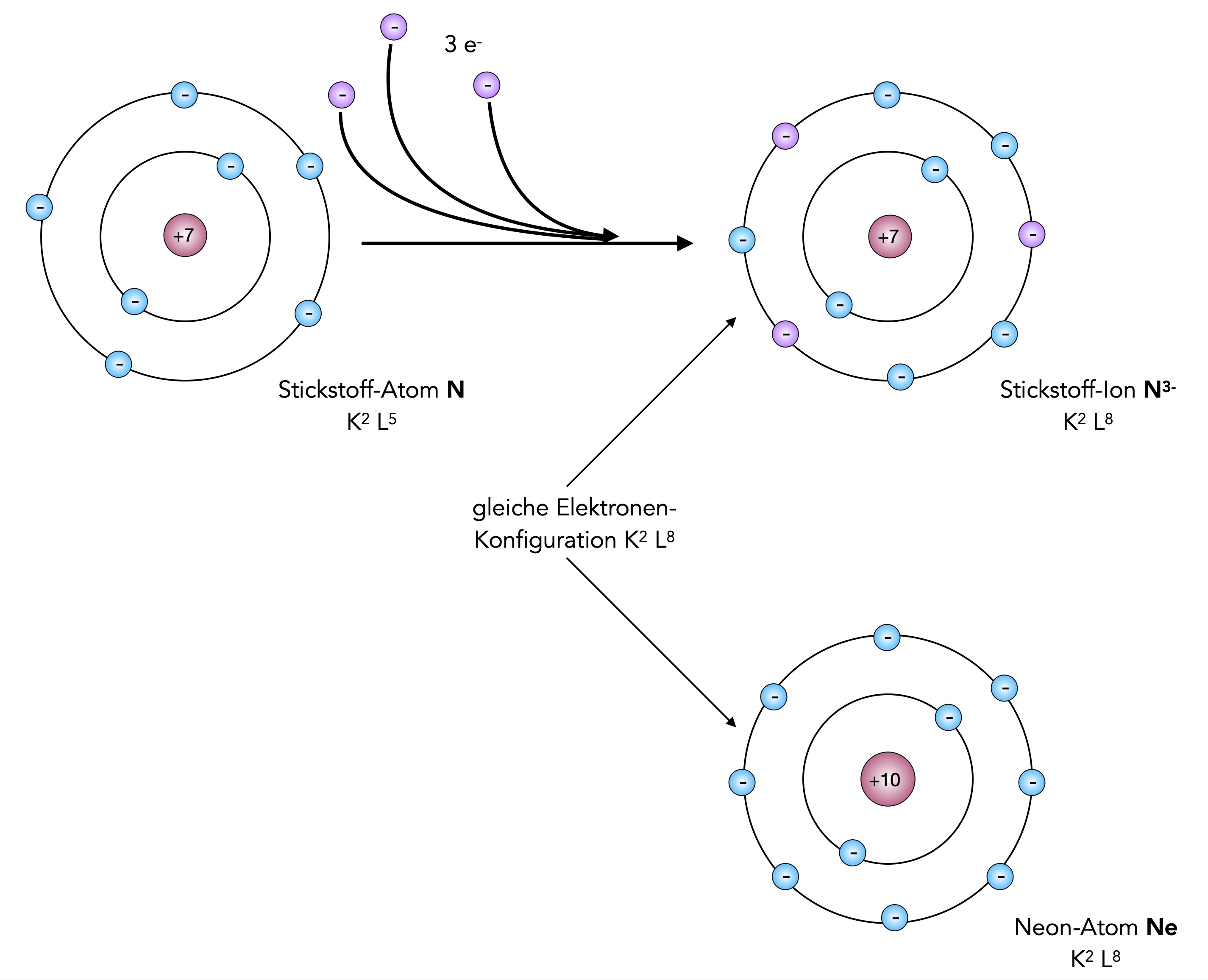 Stickstoff gelangt durch Aufnahme von drei Elektronen in den Edelgaszustand des Neons