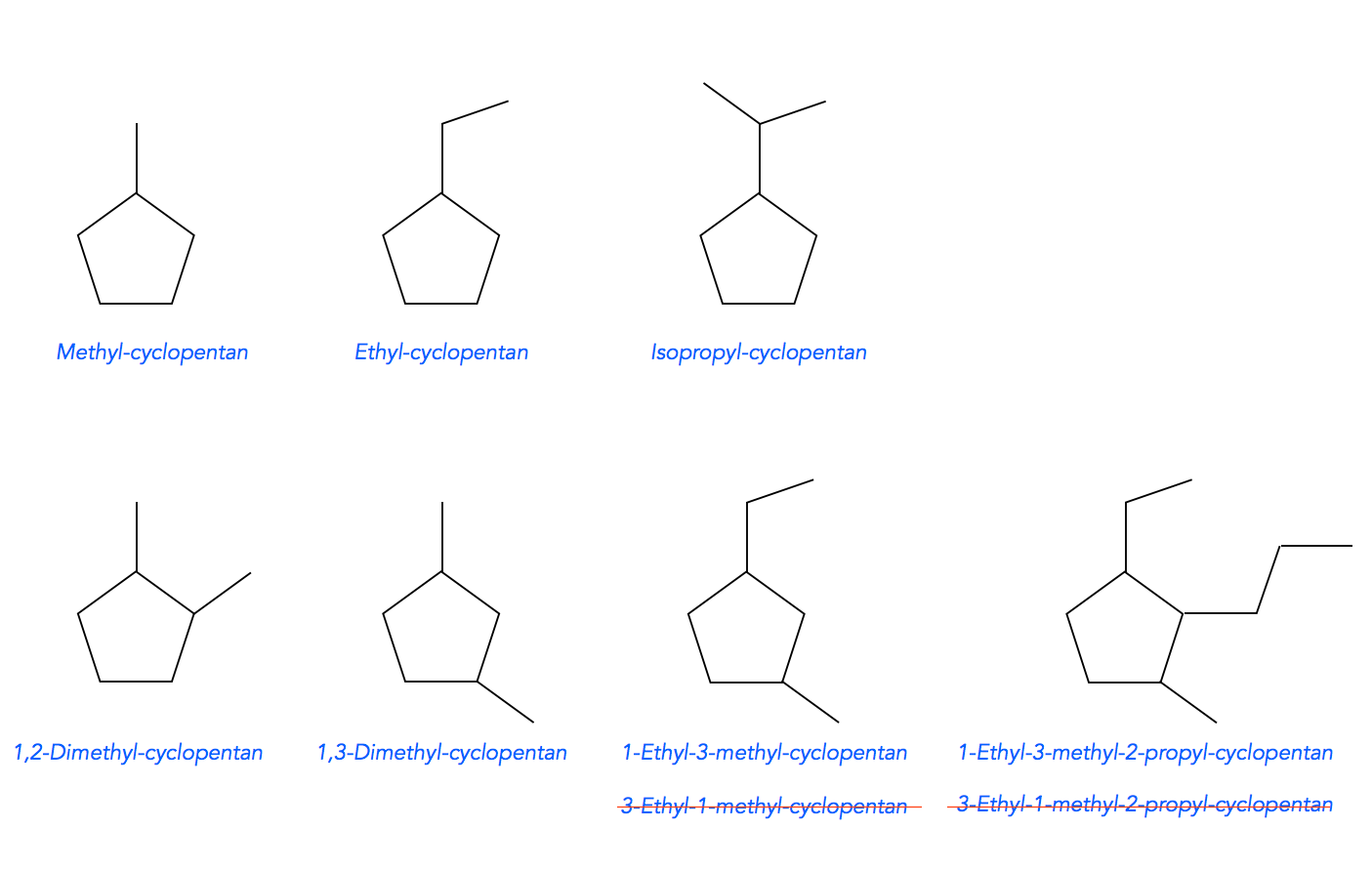 Sitzt mehr als eine Seitenkette am Ring, so sind die Positionen der Ketten durch Nummern anzugeben, ähnlich wie bei nicht-zyklischen Alkanen. Gibt es zwei Möglichkeiten der Nummerierung, so wie im Beispiel unten rechts, geht man nach der alphabetischen Reihenfolge der Seitenketten vor, so dass die alphabetisch erste Seitenkette die kleinere Nummer bekommt. Ein Cyclopentan mit einer Ethyl-Seitenkette und einer Methyl-Seitenkette an einer anderen Position wird als 1-Ethyl-3-methyl-cyclopentan bezeichnet und nicht als 3-Ethyl-1-methyl-cyclopentan.
