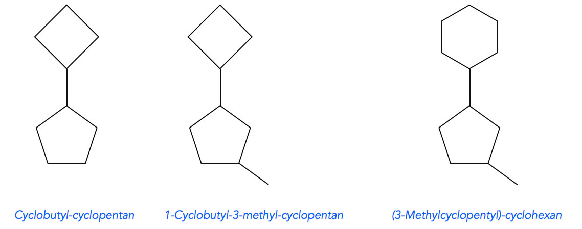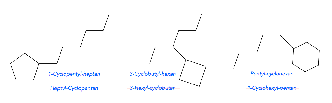 Wenn die "angehängte" Kohlenstoffkette mehr C-Atome enthält als das Cycloalkan, dann wird das Cycloalkan als "Anhängsel" der langen Kohlenstoffkette angesehen. Das 1-Cyclopentyl-heptan ist also eine Heptankette, deren erstes C-Atom mit einem Cyclopentan-Ring verknüpft ist. Diese Verbindung darf nicht als Heptyl-cyclopentan bezeichnet werden. Beim Pentyl-cyclohexan ist es wieder umgekehrt. Hier hat der Ring mehr C-Atome als die Kette, darum ist der Ring das namensgebende Grundgerüst. Diese Verbindung darf nicht als 1-Cyclohexyl-pentan bezeichnet werden.