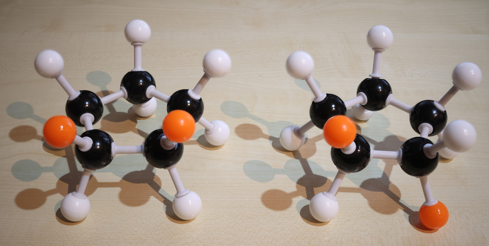 Hier sehen wir ein Cyclopentan-Molekül mit zwei Substituenten (rot markiert). Links befinden sich die beiden Substituenten in der cis-Stellung, rechts in der trans-Stellung. Achten Sie darauf, dass beide Moleküle die gleiche Konstitution haben: Fünf C-Atome sind zu einem Ring angeordnet, und an zwei benachbarten C-Atomen befindet sich ein Substituent.
