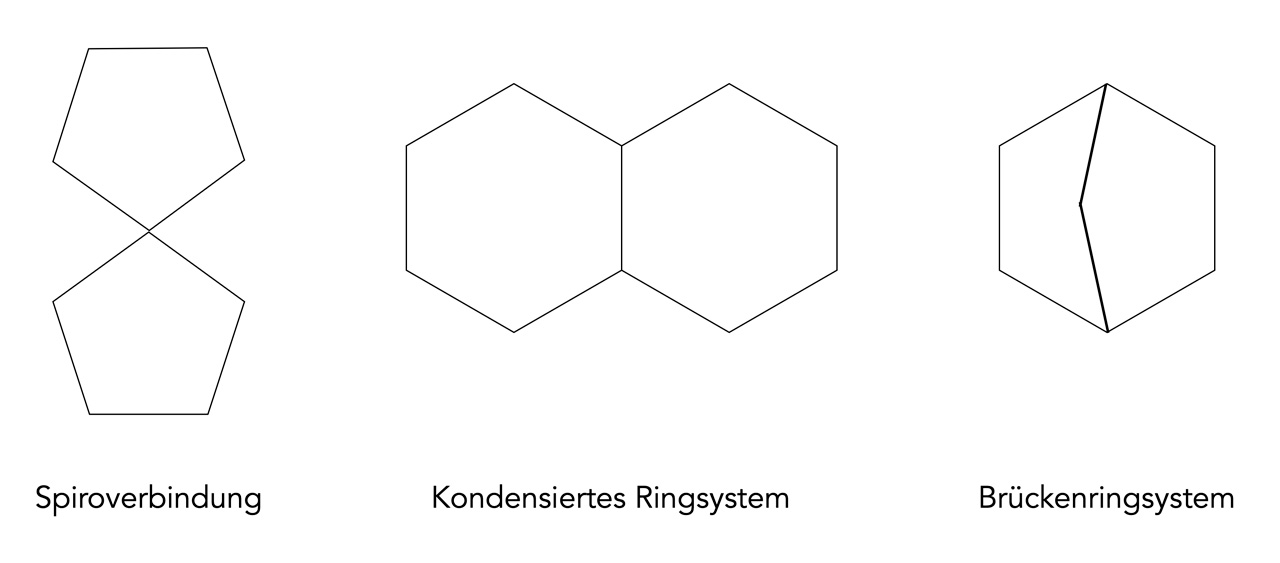Bei den Spiroverbindungen haben zwei Ringe ein Kohlenstoff-Atom gemeinsam, bei den kondensierten Ringsystemen teilen sich zwei Ringe zwei Kohlenstoff-Atome, und bei den Brückenringsystemen sind zwei C-Atome des Rings durch eine oder mehrere CH2-Gruppen miteinander zusätzlich verbunden.