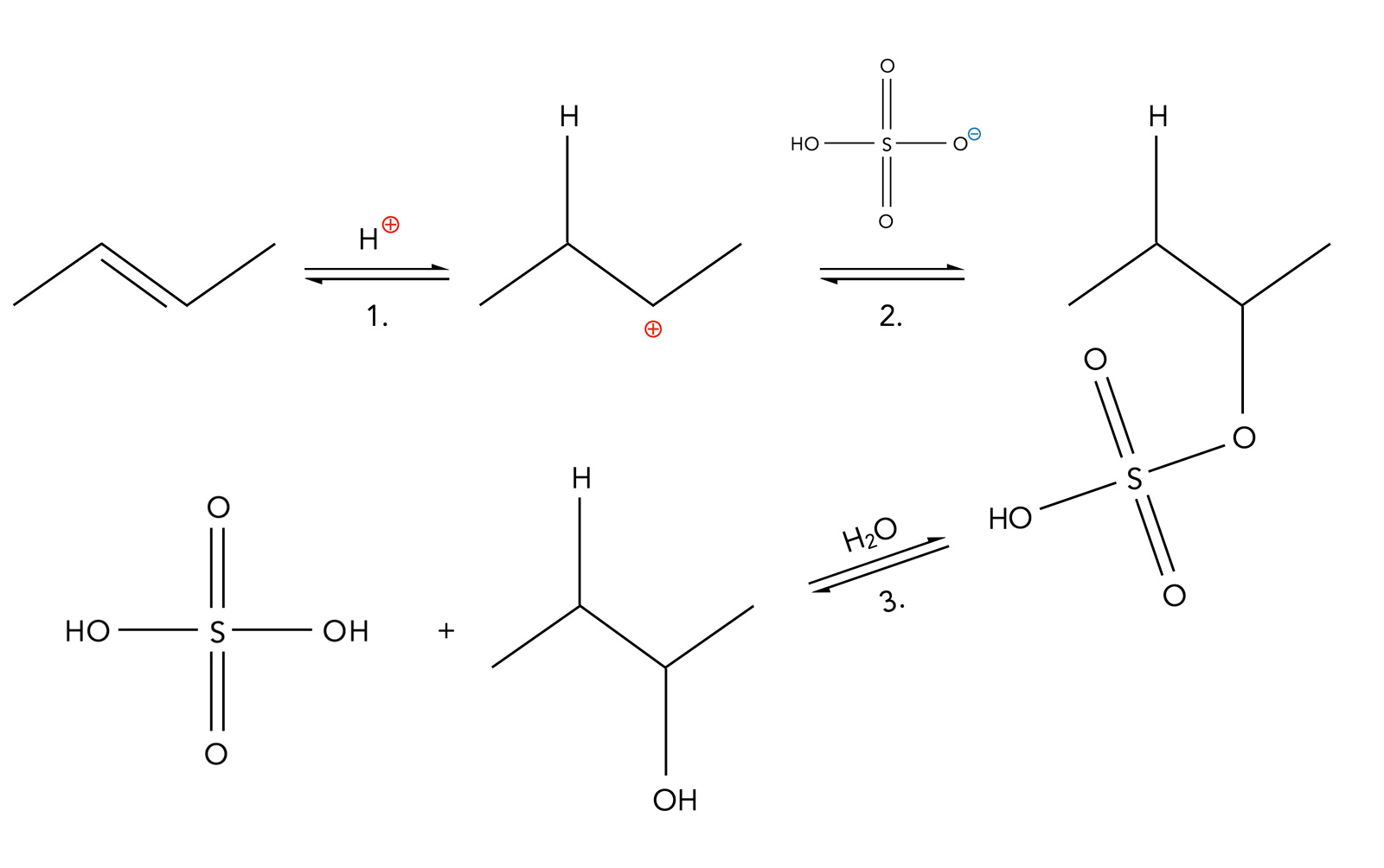 Auf diesem Bild sehen wir die Sulfonierung von Buten und die anschließende Umsetzung des Reaktionsprodukts zum Alkohol Butan-2-ol.