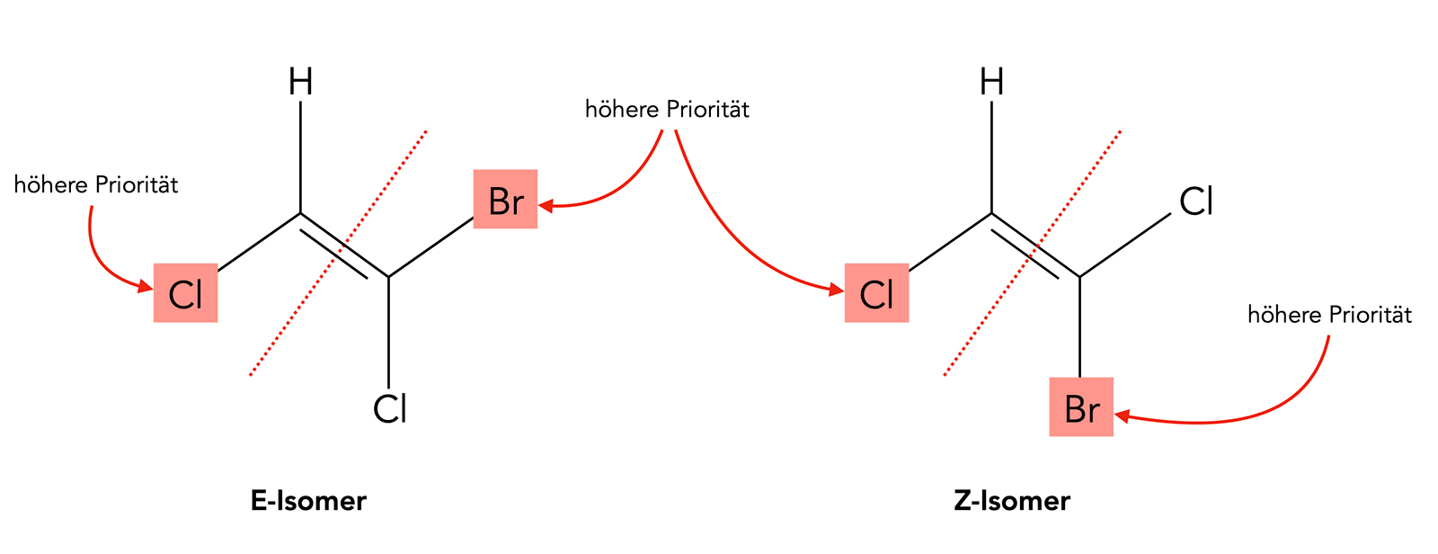 Die beiden Substituenten mit der jeweils höchsten Priorität befinden sich bei dem linken Molekül auf gegenüberliegenden Seiten der C=C-Doppelbindung, daher bezeichnet man dieses Isomer als E-Isomer ('E' könnte für "entfernt" stehen).