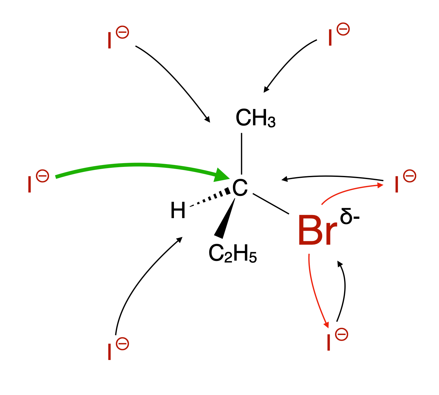 - Nun könnte das Iod-Anion ja auch von "rechts" angreifen. Dummerweise ist das Brom-Atom nicht nur sehr groß, sondern trägt auch noch eine negative Teilladung, wegen der hohen Elektronegativität von Brom. Es würde also nicht nur eine sterische Hinderung stattfinden (durch die Größe des Br-Atoms), sondern das negativ geladene Nucleophil würde auch noch elektrisch abgestoßen (was durch die roten Pfeile angedeutet wird).