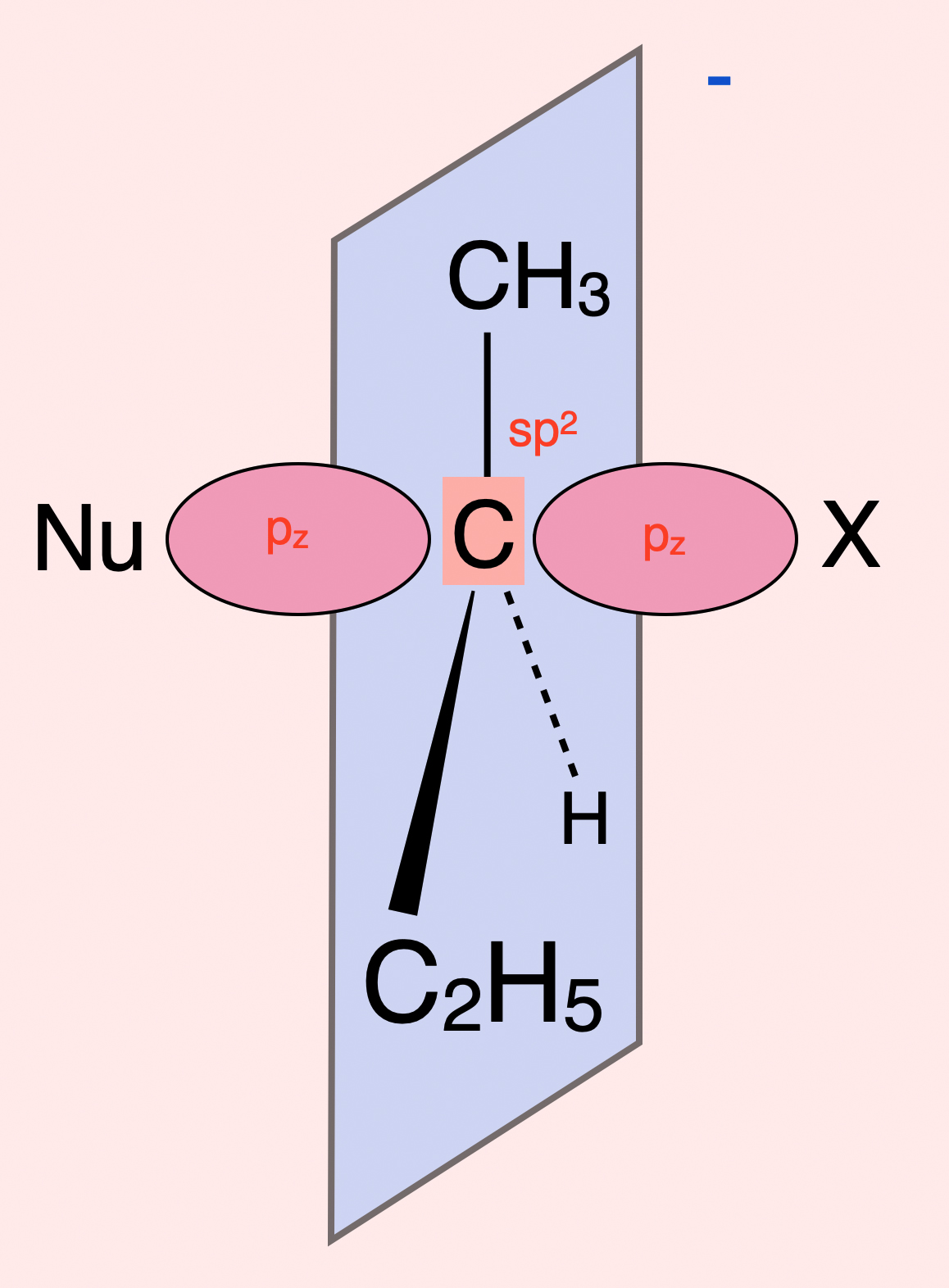 Das mittlere C-Atom ist sp2-hybridisiert, die drei assoziierten Substituenten liegen daher in einer Ebene. Die beiden Lappen des pz-Orbitals ragen nach links und rechts aus dieser Ebene heraus. Das pz-Orbital nimmt dann auf der linken Seite Kontakt mit einem Orbital des Nucleophils Nu auf, und hält auf der rechten Seite noch Kontakt mit dem Nucleofug X.