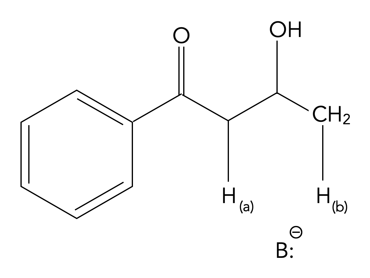Die oben gezeigte Verbindung (ein Aldol) wird von einer starken Base angegriffen. Begründen Sie, welches der beiden H-Atome (a) oder (b) bei dieser E1cB-Eliminierung von der Base abstrahiert wird.