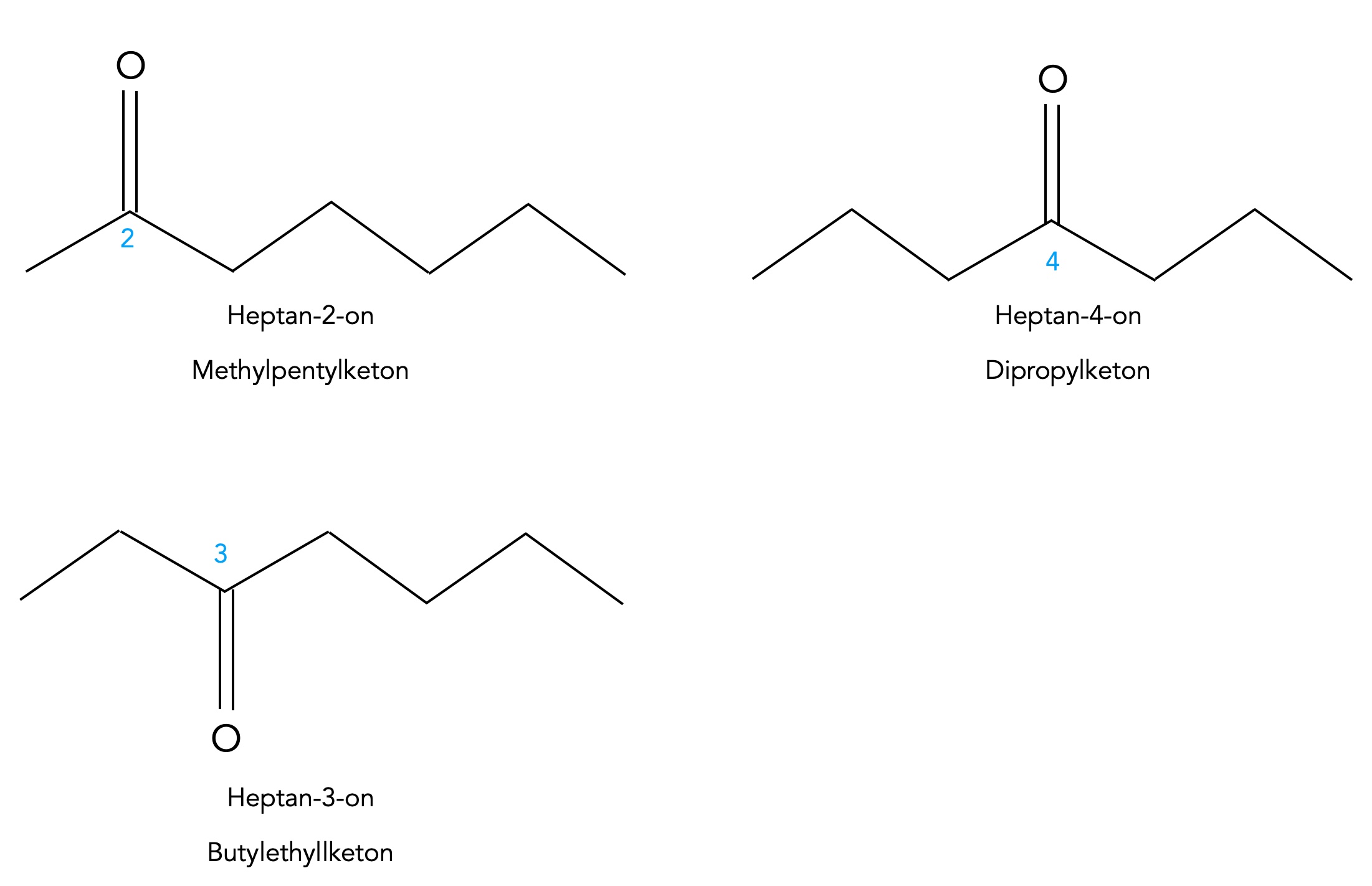Auf dem oberen Bild sehen wir drei einfache Alkanone, also von Alkanen abgeleitete Ketone: