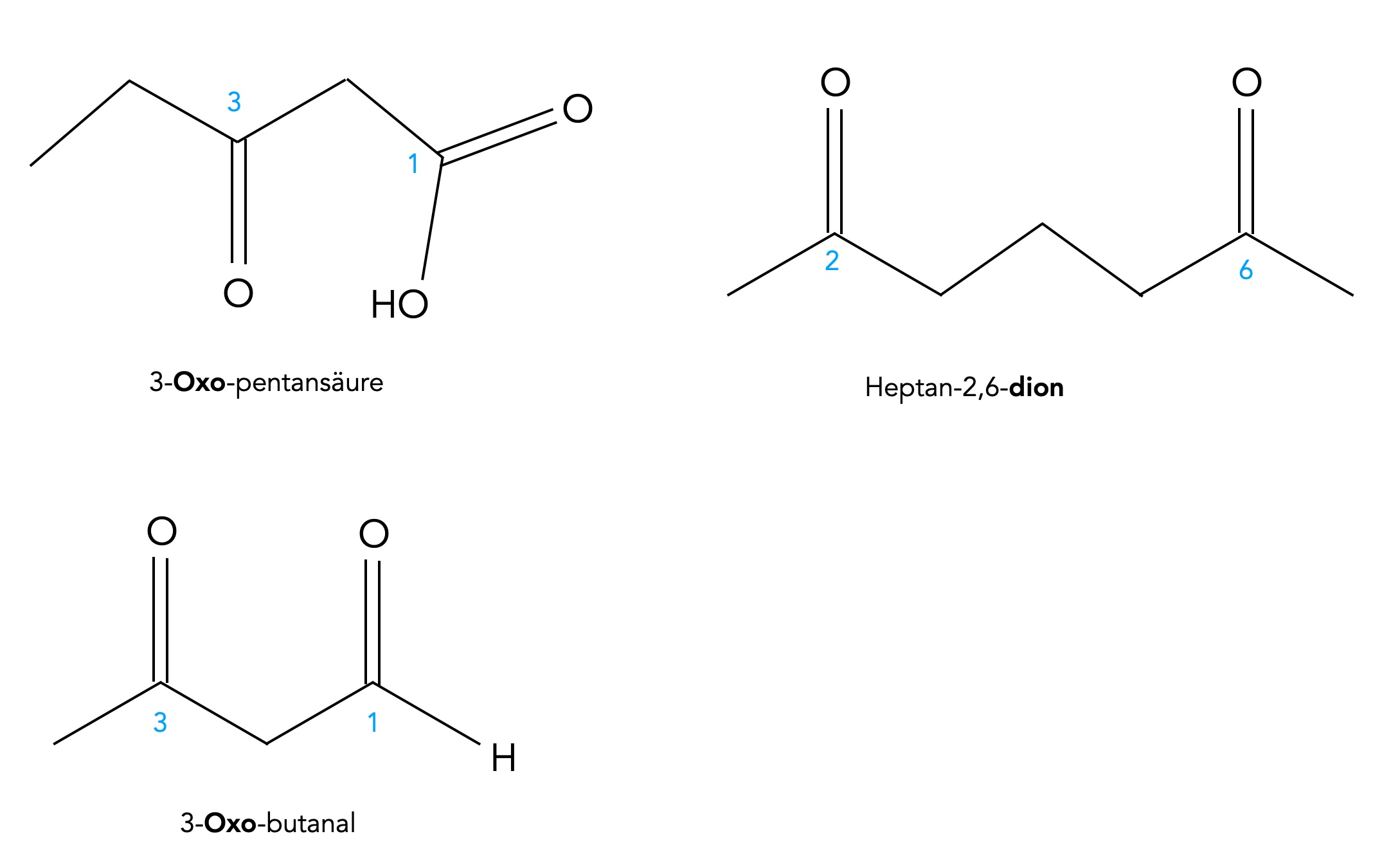 Im ersten Beispiel hat die Carboxylgruppe die höchste Priorität, die Ketogruppe an Position 3 wird also als Oxogruppe bezeichnet.