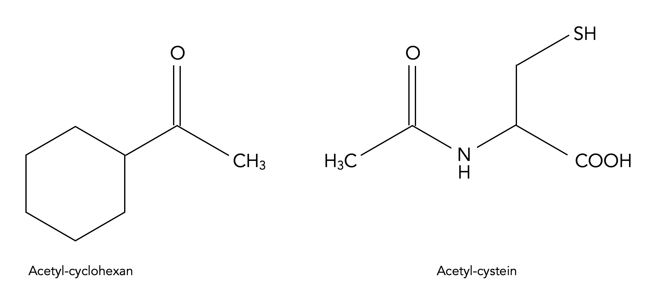 Hier sehen wir zwei Verbindungen mit einer Acetyl-Gruppe, das Acetyl-cyclohexan und das Acetyl-cystein. Der Name "Acetyl" für die funktionelle Gruppe -CO-CH3 wird von der IUPAC übrigens offiziell anerkannt, insofern handelt es sich nicht um eine Trivialnamen im üblichen Sinne. Die Bindestriche dienen wieder nur der besseren Lesbarkeit am Bildschirm oder auf dem Handy, in Fachbüchern werden sie meistens weggelassen.