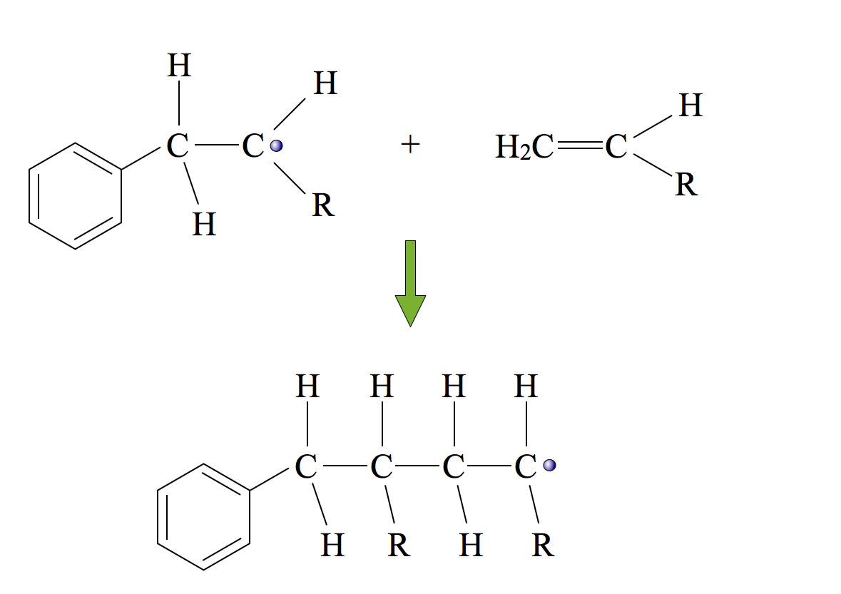 Das Radikal und ein Alken-Molekül stoßen zusammen. R steht dabei für den variablen Rest. Im Falle von Polyethylen ist R einfach ein H-Atom, im Fall von Polypropylen eine Methylgruppe, beim Polystyrol ein ganzer Benzolring.
