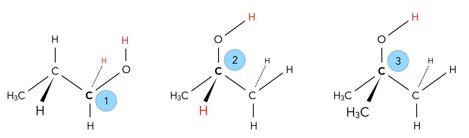 Primäre, sekundäre und tertiäre Alkohole im Vergleich, die für eine Oxidation zur Verfügung stehenden H-Atome sind rot hervorgehoben.
