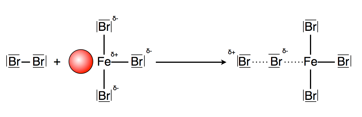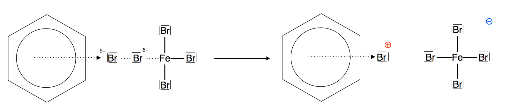 Das aromatische System des Benzols ist wegen der sechs delokalisierten π-Elektronen ein Angriffsziel für elektrophile Teilchen. Br2-Moleküle sind allerdings nicht elektrophil, da es sich um unpolare Teilchen handelt. Damit Br2-Moleküle mit Benzol reagieren können, müssen sie erst polarisiert werden.