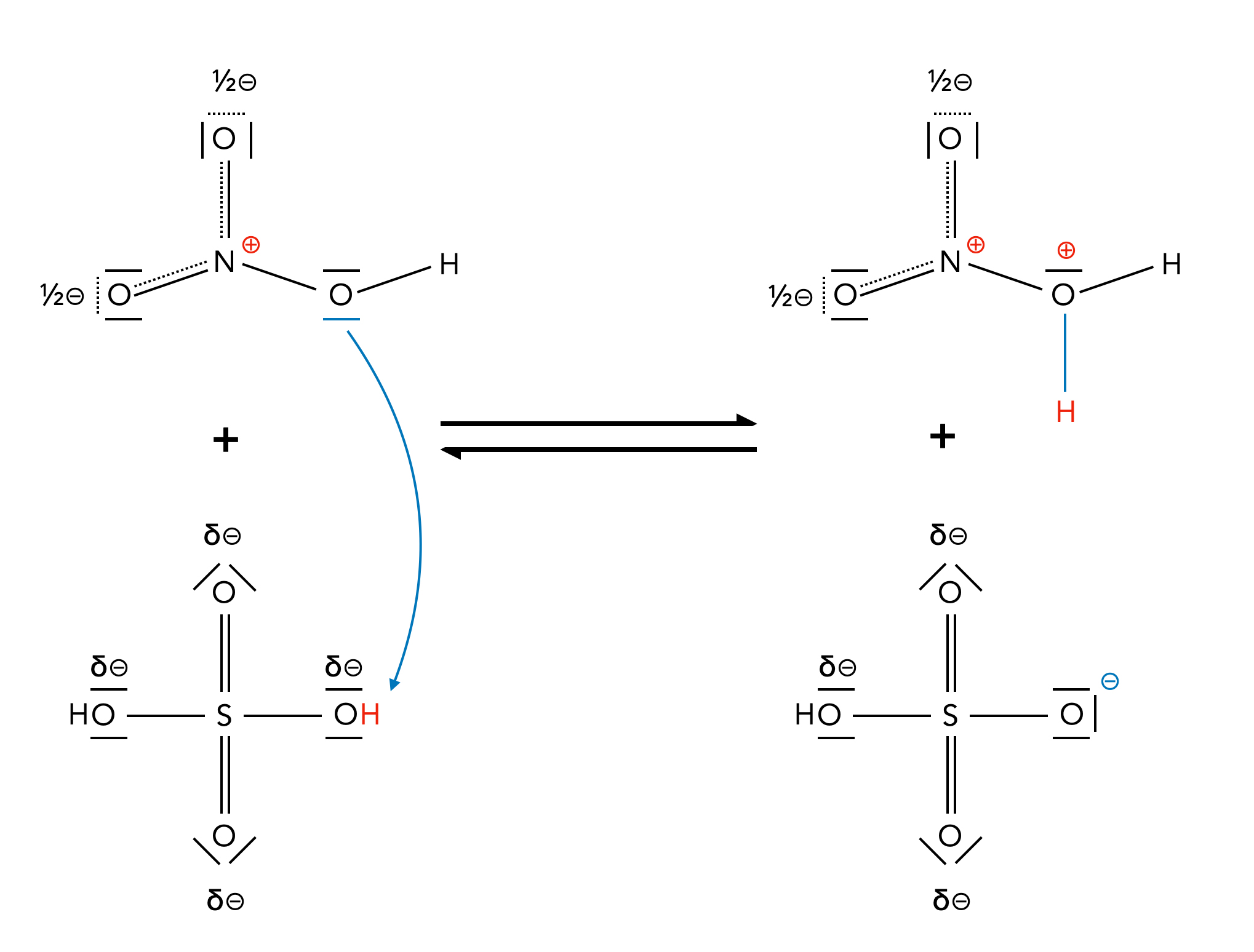 $H_{2}SO_{4} + HNO_{3} \to HSO_{4}^{-} + NO_{2}^{+} + H_{2}O$
