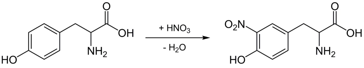 Bei den Aminosäuren, die dadurch nitriert werden, handelt es sich um Tyrosin und Phenylalanin. Das Reaktionsprodukt dieser Nitrierung ist gelb gefärbt, und darum eignet sich die Behandlung von Lebensmitteln mit Salpetersäure zum Nachweis von Proteinen. Wenn konz. Salpetersäure aus Versehen auf die menschliche Haut gelangt, verfärbt diese sich ebenfalls gelblich, wegen der vielen Proteine in den Zellen der Haut.