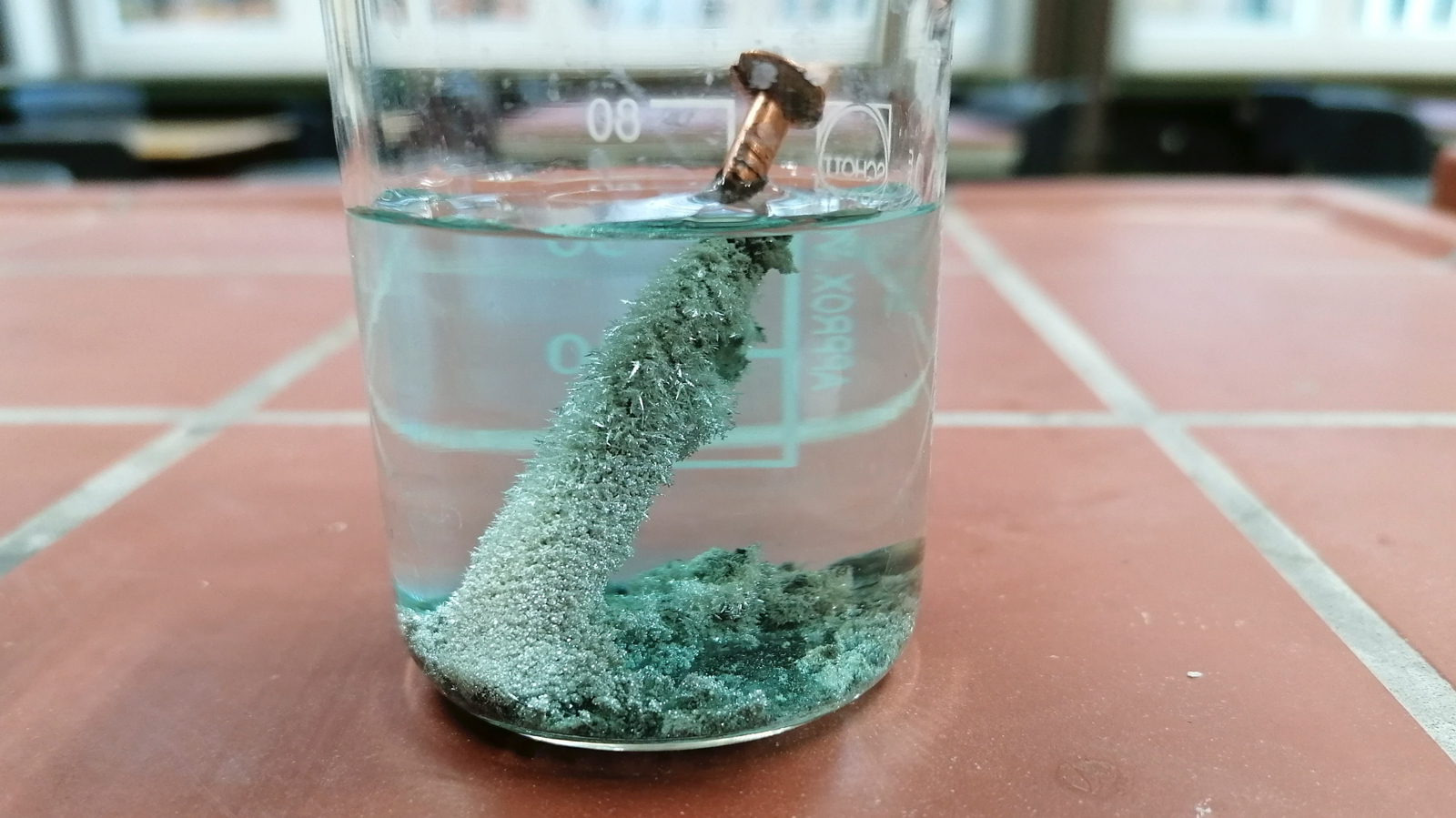 Nach wenigen Sekunden bildet sich auf dem Kupfernagel eine dunkle Schicht. Lässt man den Kupfernagel jedoch mehrere Tage in der Silbernitrat-Lösung stehen, bilden sich eindrucksvolle Kristallnadeln, die eine graue Färbung haben. Ein Teil der Kristalle löst sich vom Kupfernagel und rieselt auf den Boden des Becherglases.