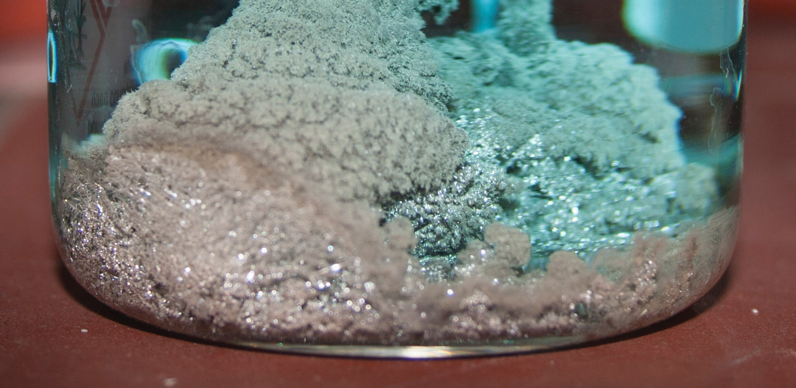 Hier sieht man am Rand des Becherglases die tatsächliche Farbe der Abscheidungen: silbergrau. Das Bild entstand übrigens noch ein paar Tage später als das obere Bild.