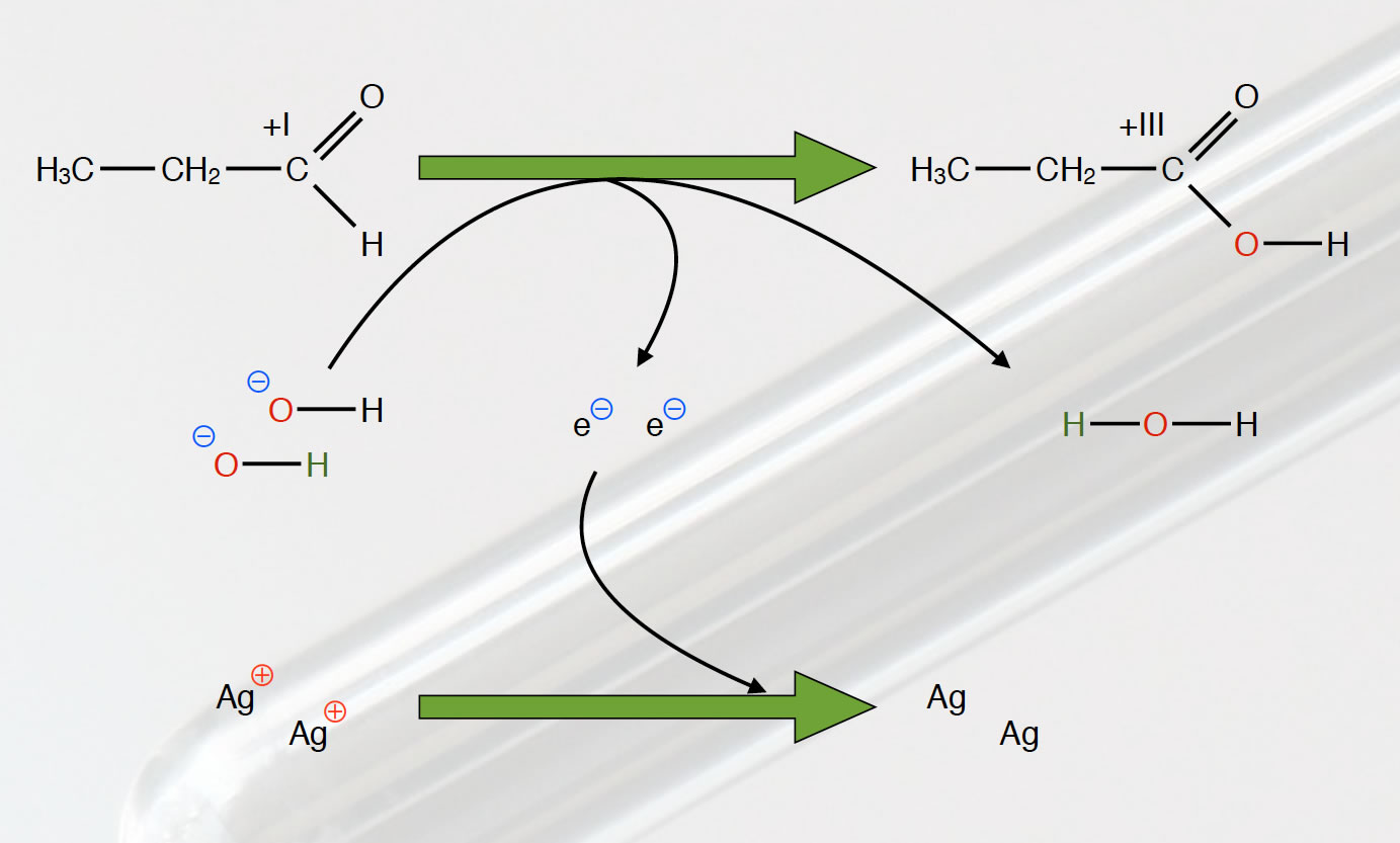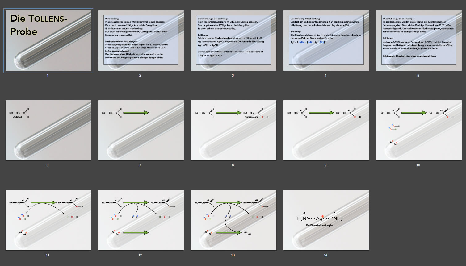 Am Ende der Unterrichtsreihe über Aldehyde und Ketone werden oft die Fehling-Probe und die Tollens-Probe besprochen und meistens auch durchgeführt. Dieser Foliensatz enthält eine Schritt-für-Schritt-Erklärung der Tollens-Probe und der ablaufenden Redoxreaktion.