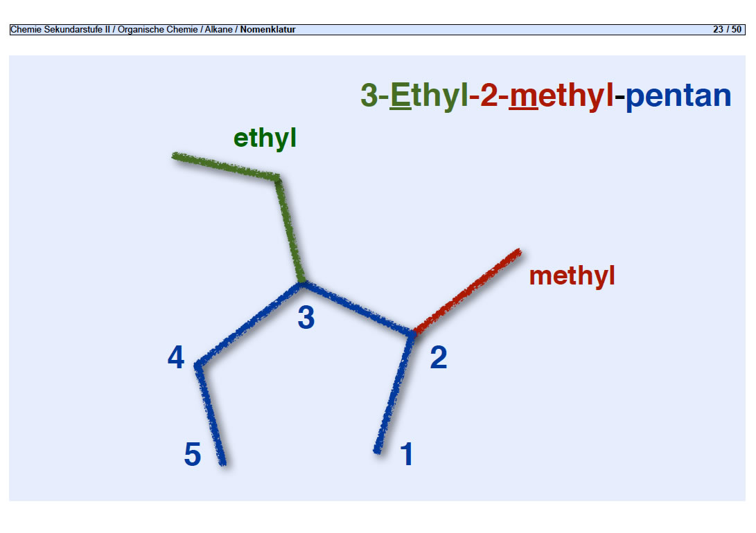 Sie können diesen Foliensatz in der Stufe EF oder auch bereits in der Stufe 9 einsetzen, wenn das Thema "Alkane" behandelt wird. Die Folie 23 aus dem digitalen Foliensatz "Nomenklatur der Alkane" Hier finden Sie einen Überblick über alle 50 Folien des Foliensatzes: Alle 50 Folien 10 dieser Folien können Sie sich zur Ansicht hier kostenlos herunterladen.