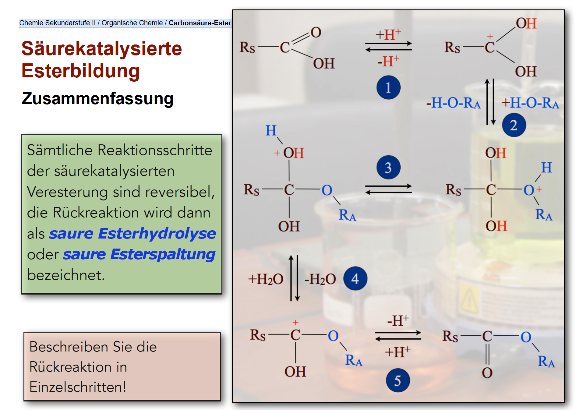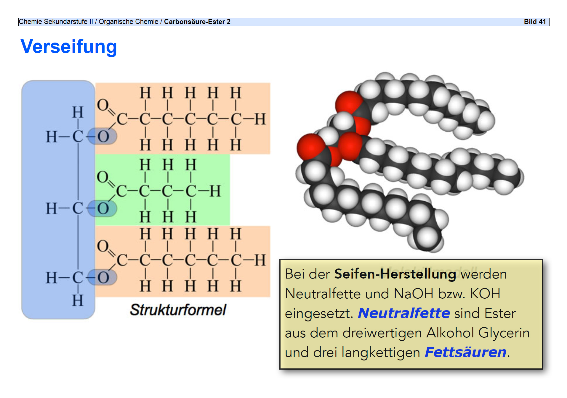 Sie können diesen umfangreichen Foliensatz (über 40 Folien!) in der Stufe EF einsetzen, nachdem das Thema "Ester 1" behandelt wurde. Auf Gleichgewichts-Reaktionen wird in diesem und dem nächsten Foliensatz noch nicht eingegangen, daher ist eine Behandlung des Themas "Reaktionsgeschwindigkeit" keine Voraussetzung für den Einsatz dieses Foliensatzes.