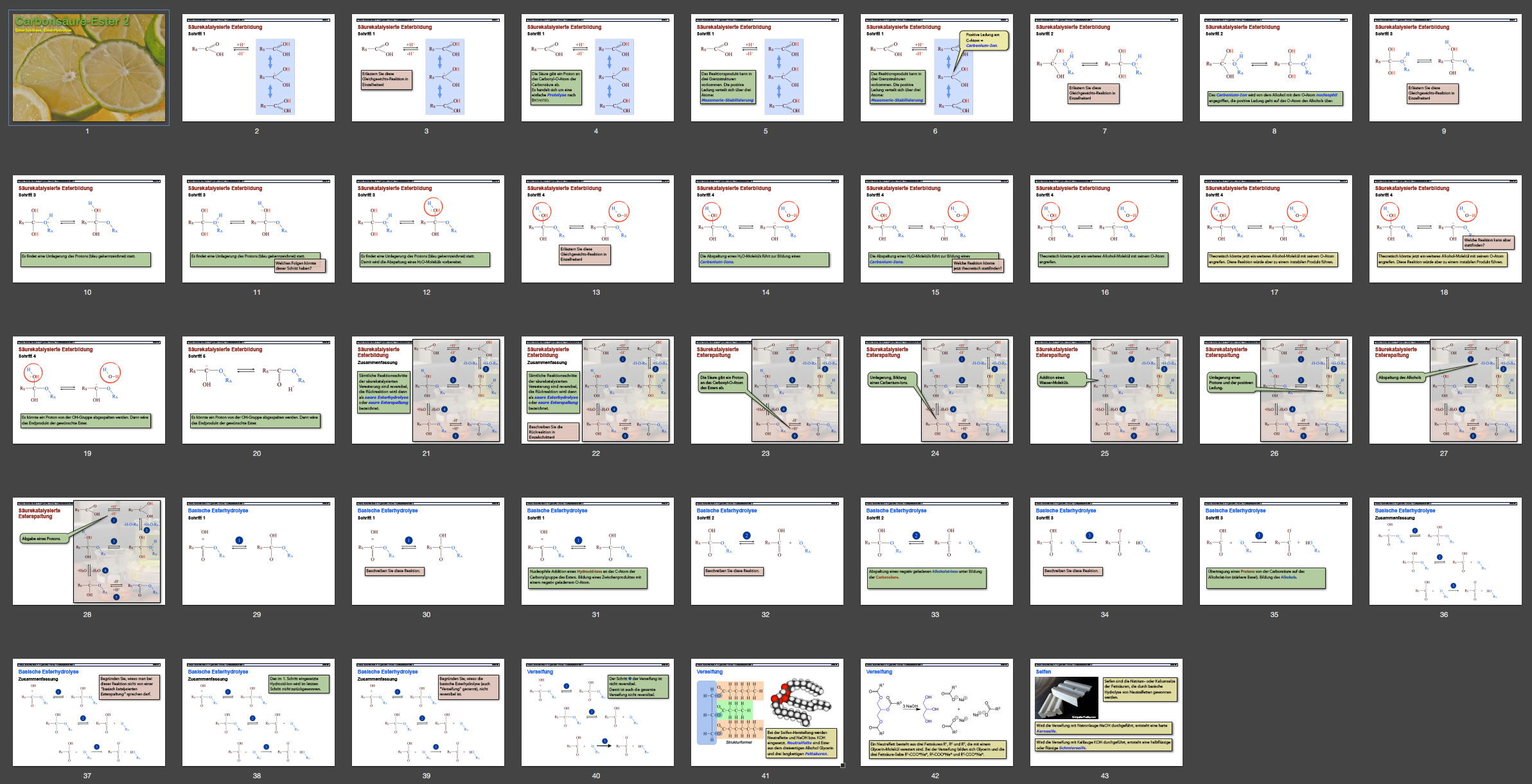 Der Foliensatz ist für den Distanzunterricht während der Corona-Pandemie entwickelt worden. Er kann abschnittsweise während mehrerer Videokonferenzen zum Thema "Ester" gezeigt werden. Die Videokonferenz-Systeme bieten dazu ja eine Präsentationsfunktion an. Die Fragen und Aufgaben auf den Folien sind sehr kleinschrittig gestellt, so dass möglichst viele Schüler(innen) Gelegenheit haben, einen kurzen mündlichen Beitrag zu liefern.