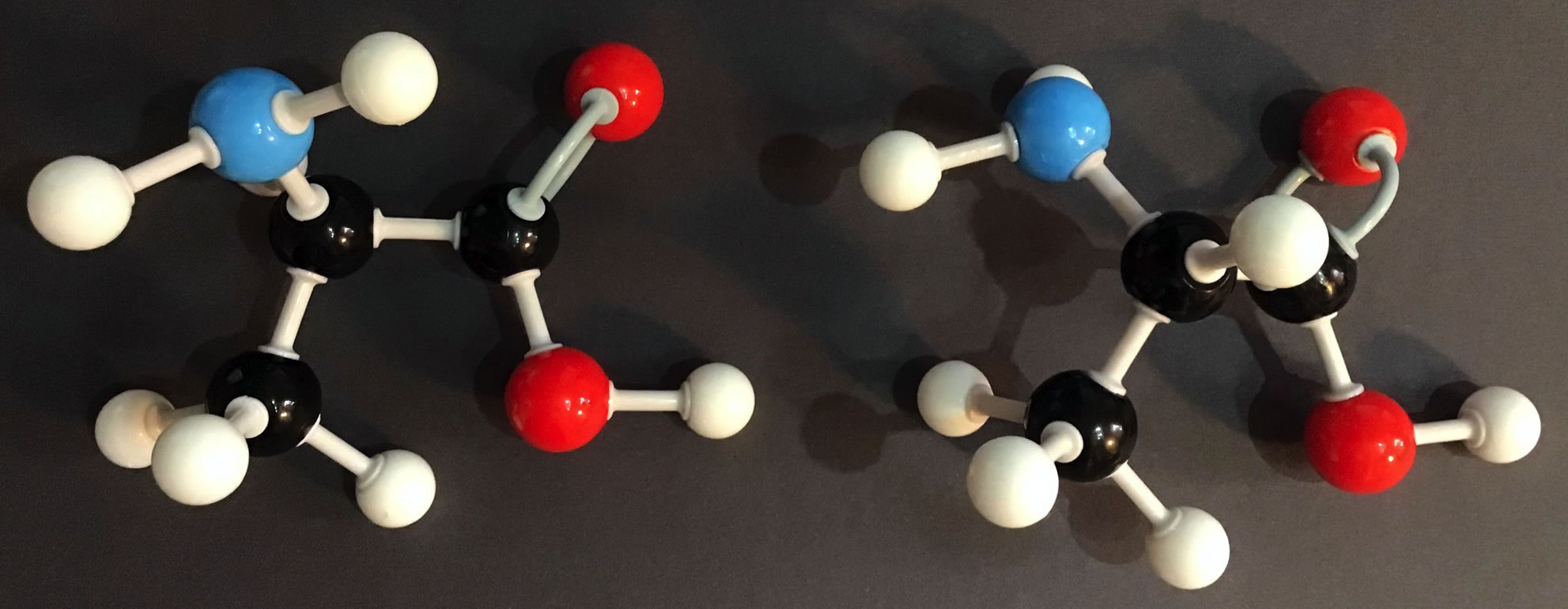 Die Abbildung 1 zeigt zwei Molekülmodelle des Alanins. Das rechte Modell wurde spiegelbildlich zum linken Modell gebaut. Die beiden Amino-Gruppen befinden sich jeweils oben bzw. vorne, der Methyl-Rest zeigt bei beiden Modellen nach unten, und das alpha-H-Atom befindet sich hinten.