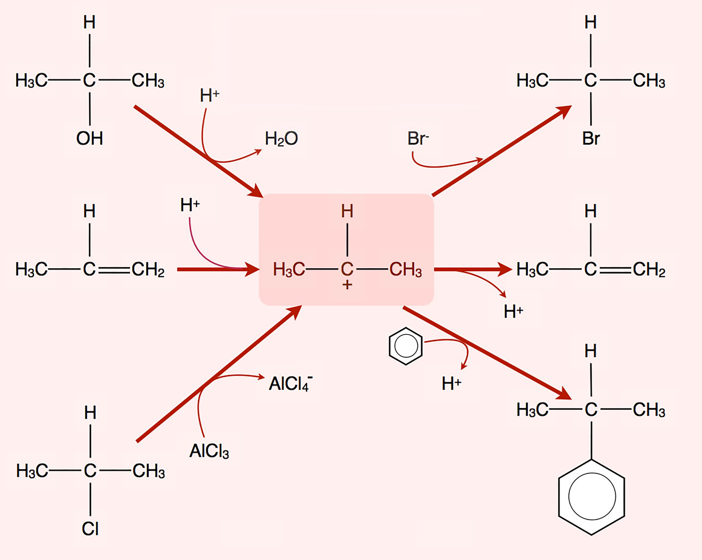 Carbenium-Ionen spielen bei mehreren organischen Reaktionstypen eine wichtige Rolle, vor allem bei der elektrophilen Addition und bei der nucleophilen Substitution.