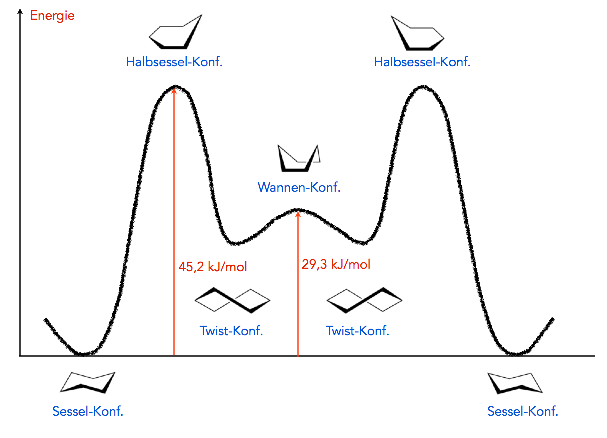 Energiediagramm der verschiedenen Konformationen des Cyclohexans