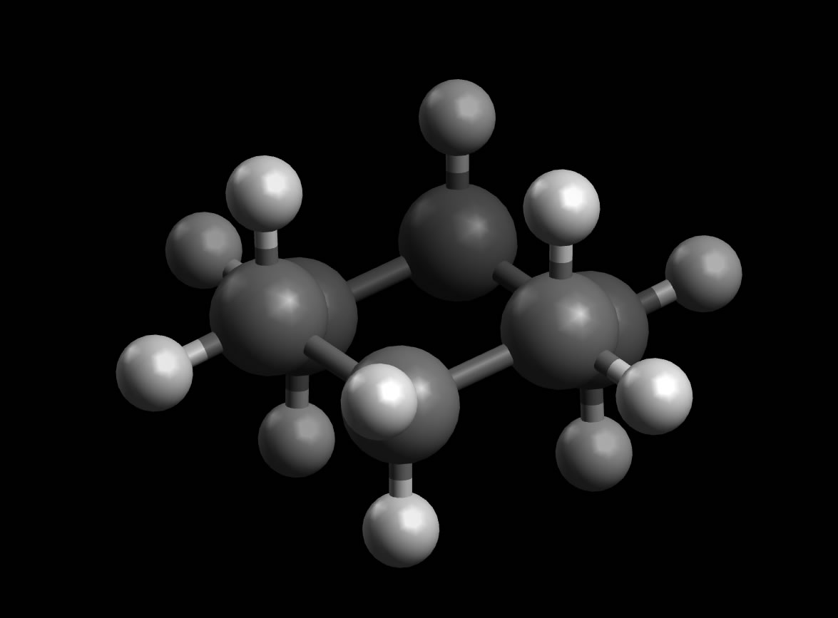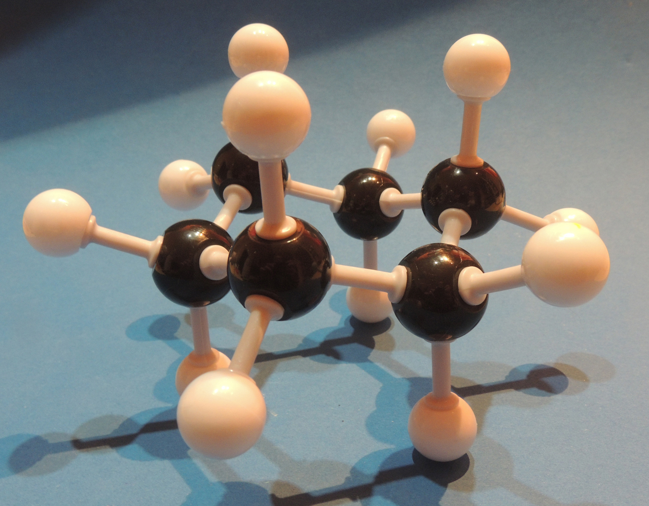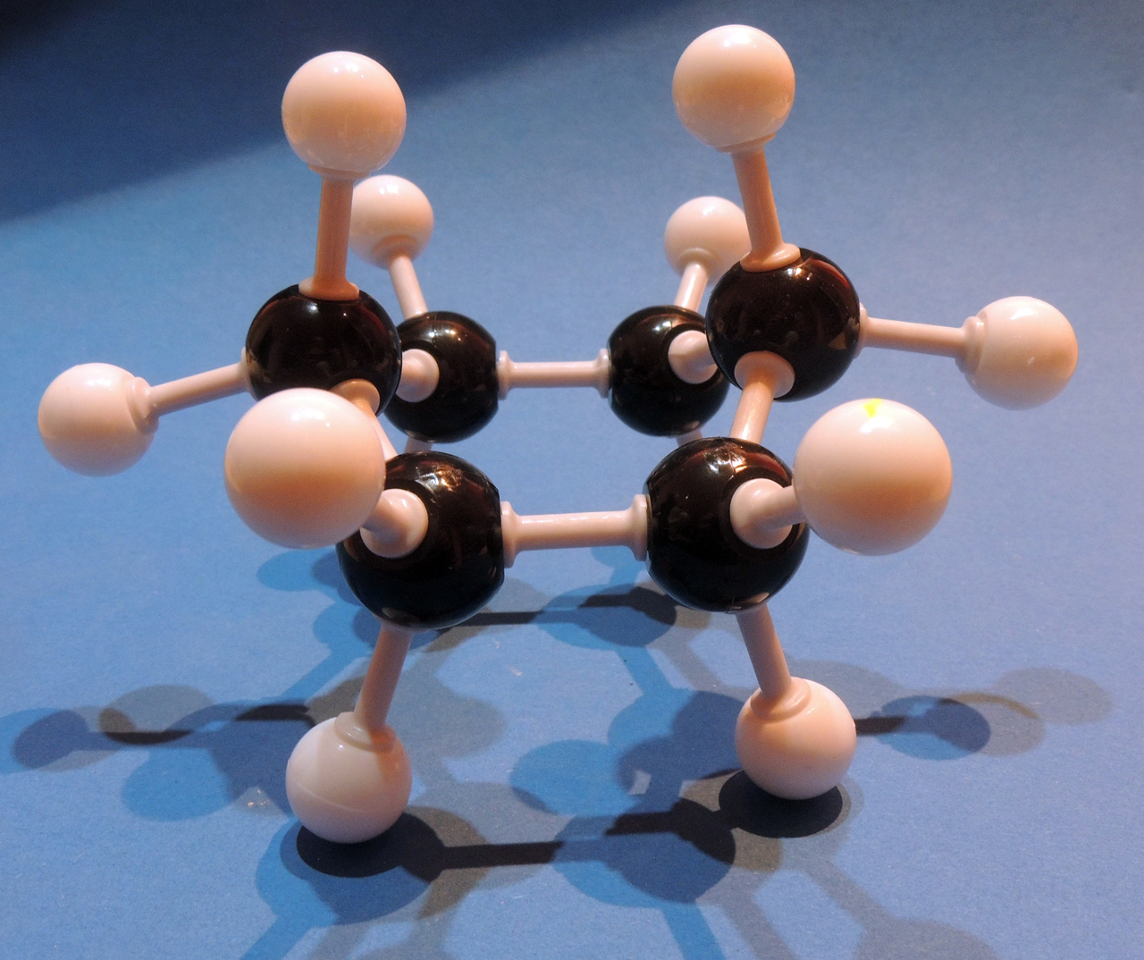 Ein Cyclohexan-Modell mit einem Molekülbaukasten kann ohne Kraftaufwand zusammengebaut werden, lästige Winkelspannungen wie beispielsweise beim Bau eines Cyclopropan-Moleküls treten hier so gut wie nicht auf. Allerdings erhält man beim Zusammenbauen kein perfektes regelmäßiges Sechseck, sondern eine energieärmere Konformation, die Sessel- oder die Wannen-Konformation. Die Sessel-Konformation sehen Sie in den beiden ersten Abbildungen, die Wannen-Konformation wird in der nächsten Abbildung gezeigt: