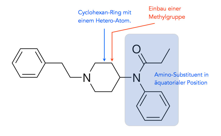 Baut man jedoch eine Methyl-Gruppe in den Cyclohexan-Ring ein (roter Pfeil in der Abbildung), dann nimmt diese Methyl-Gruppe die äquatoriale Position ein, so dass der Amino-Substituent in die axiale Position gedrängt wird. Das so gebildete cis-Methyl-fentanyl ist nicht 100 mal wirksamer als Morphin, sondern 2.600 mal! Aber nicht etwa die Methyl-Gruppe ist für diese stark erhöhte Wirksamkeit verantwortlich, sondern der Lagewechsel des großen Amino-Substituenten von der äquatorialen in die axiale Position.