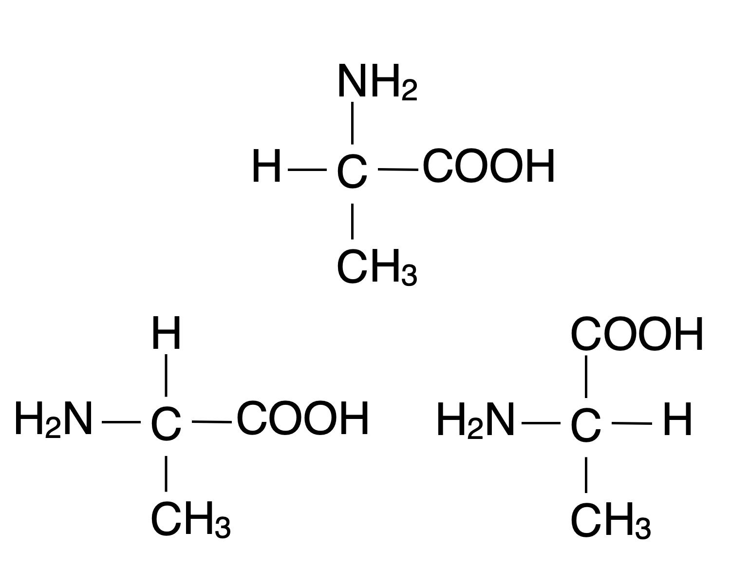 Jede dieser drei Strukturformeln ist korrekt, weil sie die Konstitution des Alanin-Moleküls richtig darstellt: Das zentrale C-Atom ist mit einer Carboxy-, einer Amino- und einer Methyl-Gruppe sowie mit einem Wasserstoff-Atom verbunden. Aber zeigen diese Strukturformeln nun das L-Alanin oder das D-Alanin? Das geht aus diesen einfachen Darstellungen nicht hervor. Mit der Fischer-Projektion dagegen kann man eindeutig sehen, um welches Enantiomer es sich handelt.